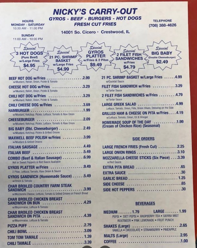 Welcome to Nicky's Carryout Restaurant, where comfort food meets convenience. Located in Crestwood, we specialize in freshly prepared fast food, including our popular burgers, hot dogs, and more. Whether you're dining in or grabbing a quick takeout, our team is dedicated to providing great food and speedy service every time. Come by today to experience why Nicky's Carryout has been a local favorite for years. We look forward to serving you!